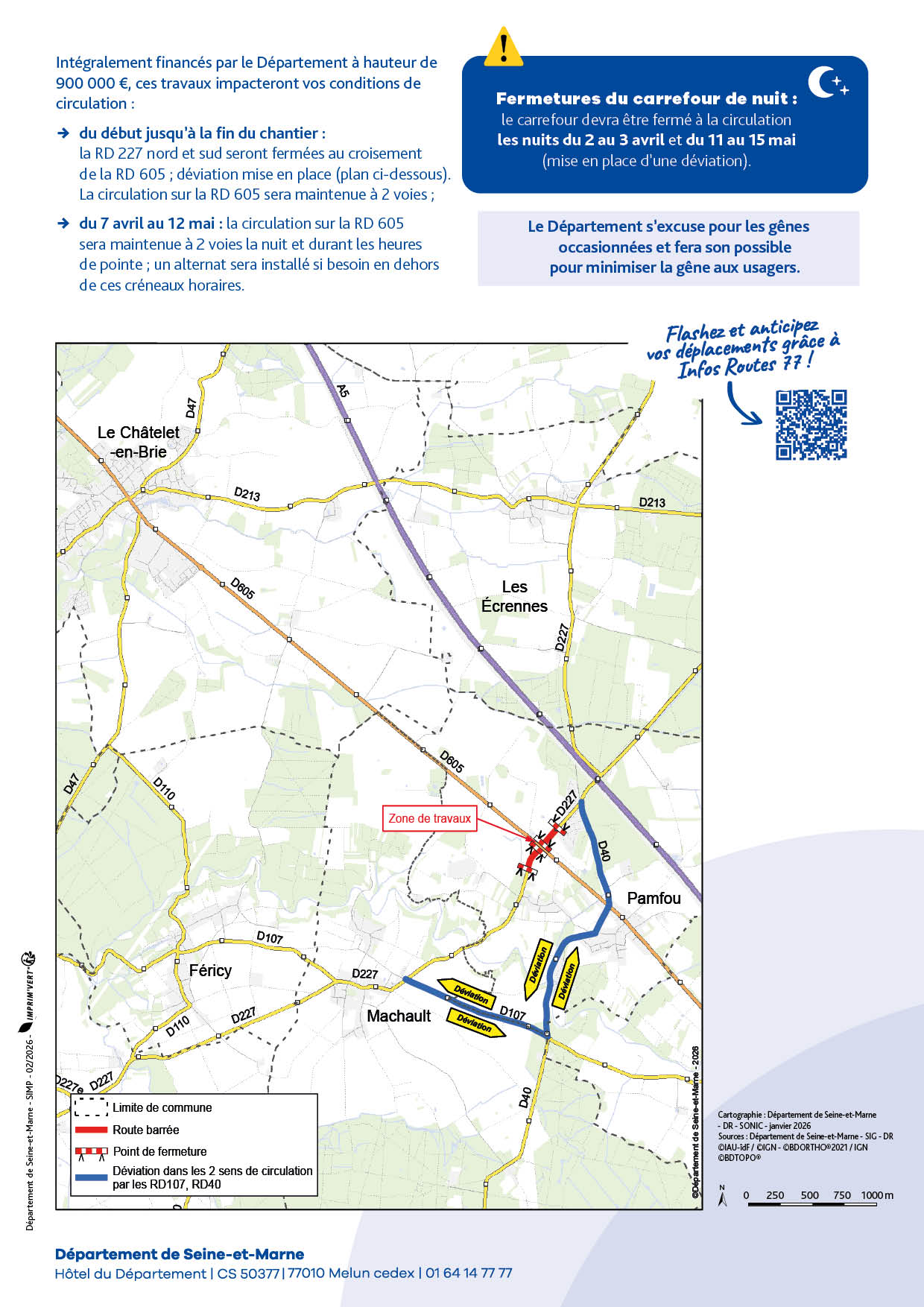 – Du 7 avril au 12 mai : la circulation sur la RD 605 sera maintenue à 2 voies la nuit et durant les heures de pointe ; un alternat sera installé si besoin en dehors de ces créneaux horaires ;